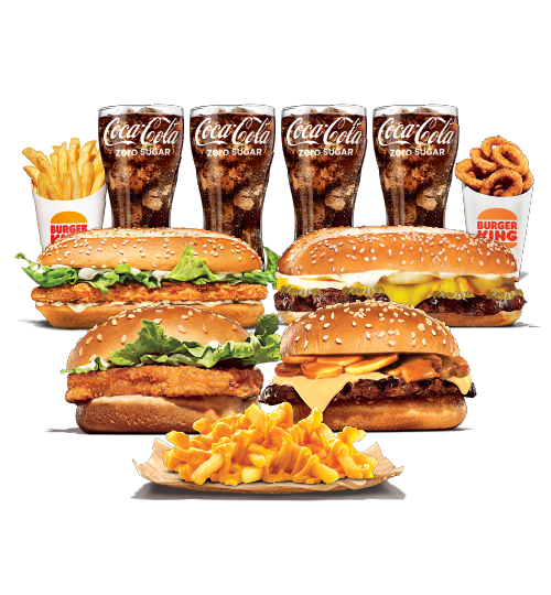 Great for sharing, this bundle includes 1 Mushroom Swiss Single, 1 Long Cheesy Onion Beef, 1 Long Chicken, 1 BK Chick’N Crisp®, 1 Medium Onion Rings, 1 Large Fries, 1 Cheesy Fries, and 4 Medium Soft Drinks. A filling feast with a mix of cheesy, crispy, and savory goodness—perfect for sharing with family or friends.
