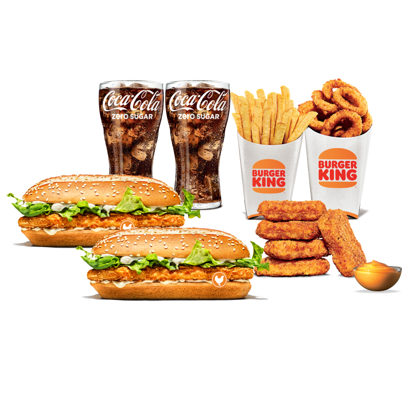 Perfect for fans of the Long Chicken sandwich, this set includes 2 Long Chicken, Medium Onion Rings, Medium Fries, 5 Chicken Nuggets with Cheese Sauce, and 2 Cokes. A hearty combo with plenty of sides for two.